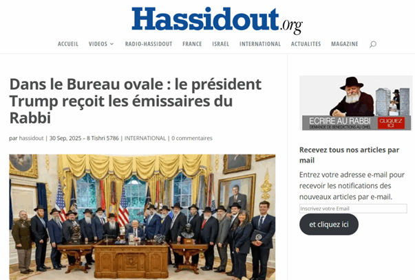 La influencia política de los Jabad-Lubavitch en todo el mundo es un tema muy controvertido. El libro de Pierre Hillard Comprendre l’empire loubavitch (Entender el imperio Jabad) trata ampliamente el tema y evoca las relaciones entre Donald Trump y esta comunidad judía mesiánica. Si hubiera que añadir un nuevo elemento para confirmar las palabras de Pierre Hillard al respecto, nos lo proporciona directamente la página web jasídica Hassidout.org.